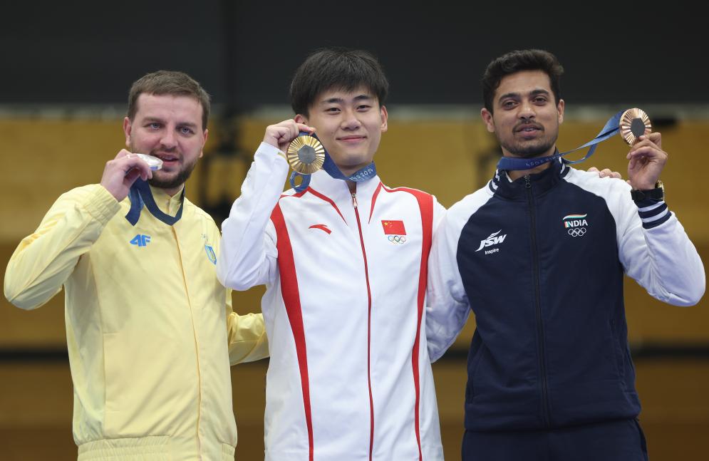 8月1日,冠軍中國選手劉宇坤(中)、亞軍烏克蘭選手庫里什(左)和季軍印度選手庫薩萊在頒獎儀式上。新華社記者 趙丁喆 攝