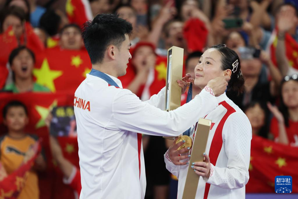 8月2日,黃雅瓊(右)在頒獎(jiǎng)儀式上給隊(duì)友鄭思維戴上金牌。