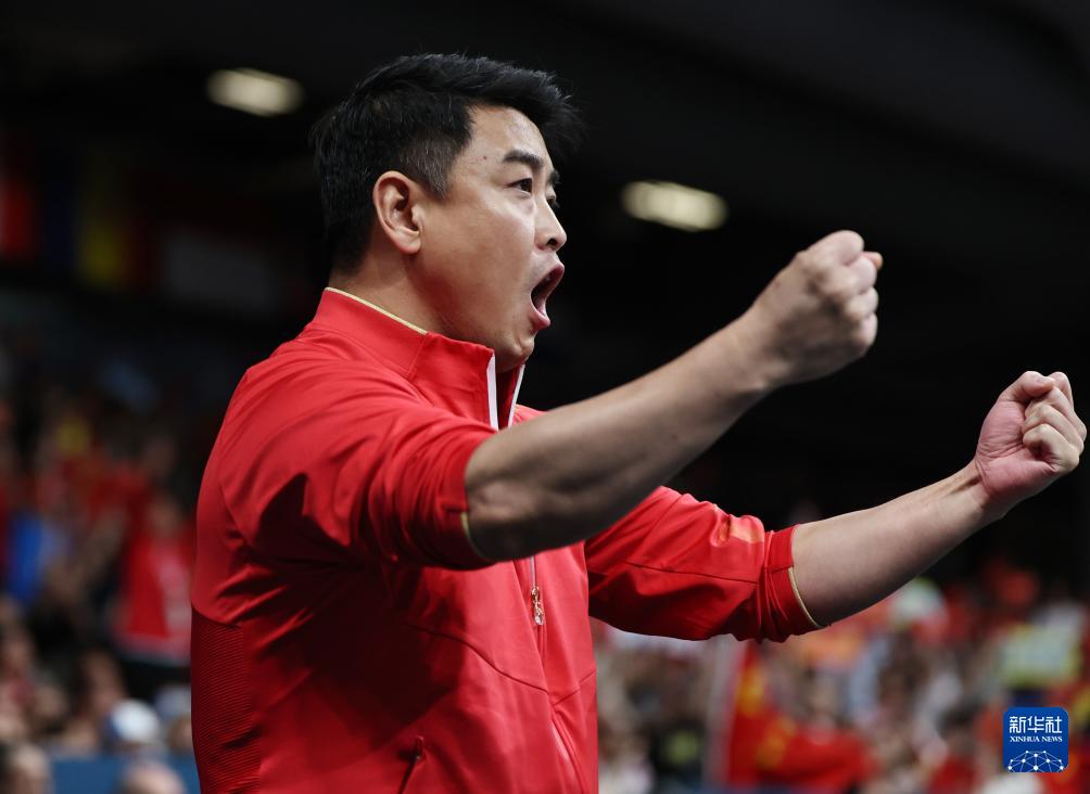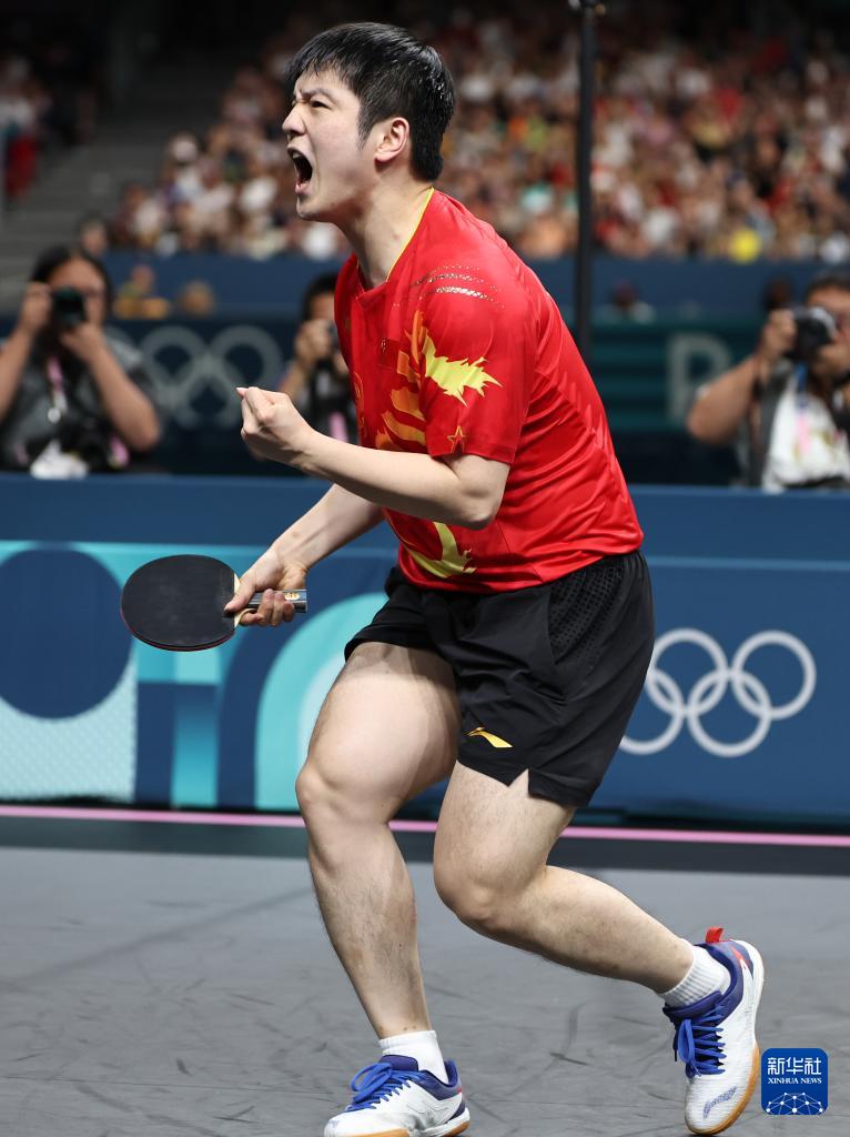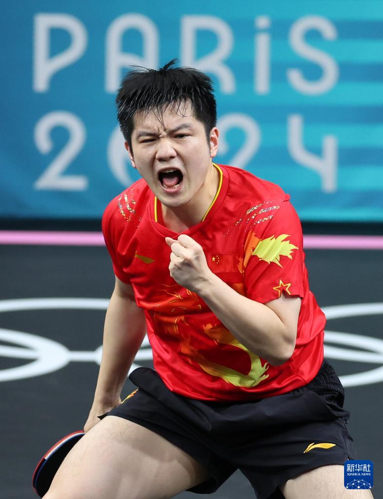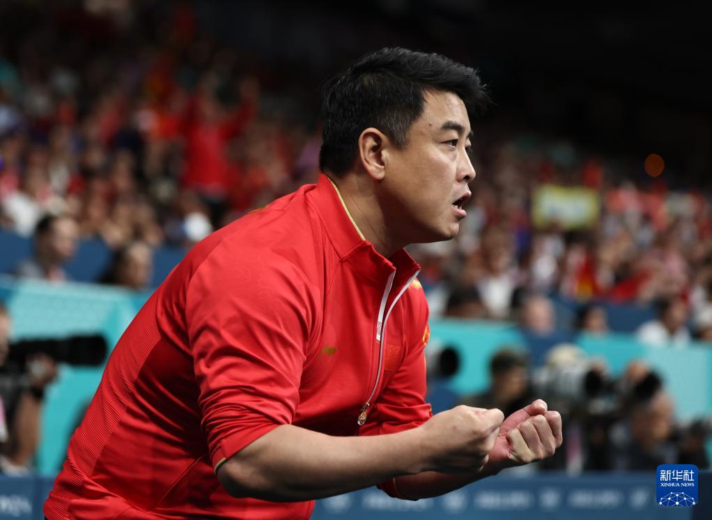 8月4日,教練王皓在比賽中慶祝樊振東得分。