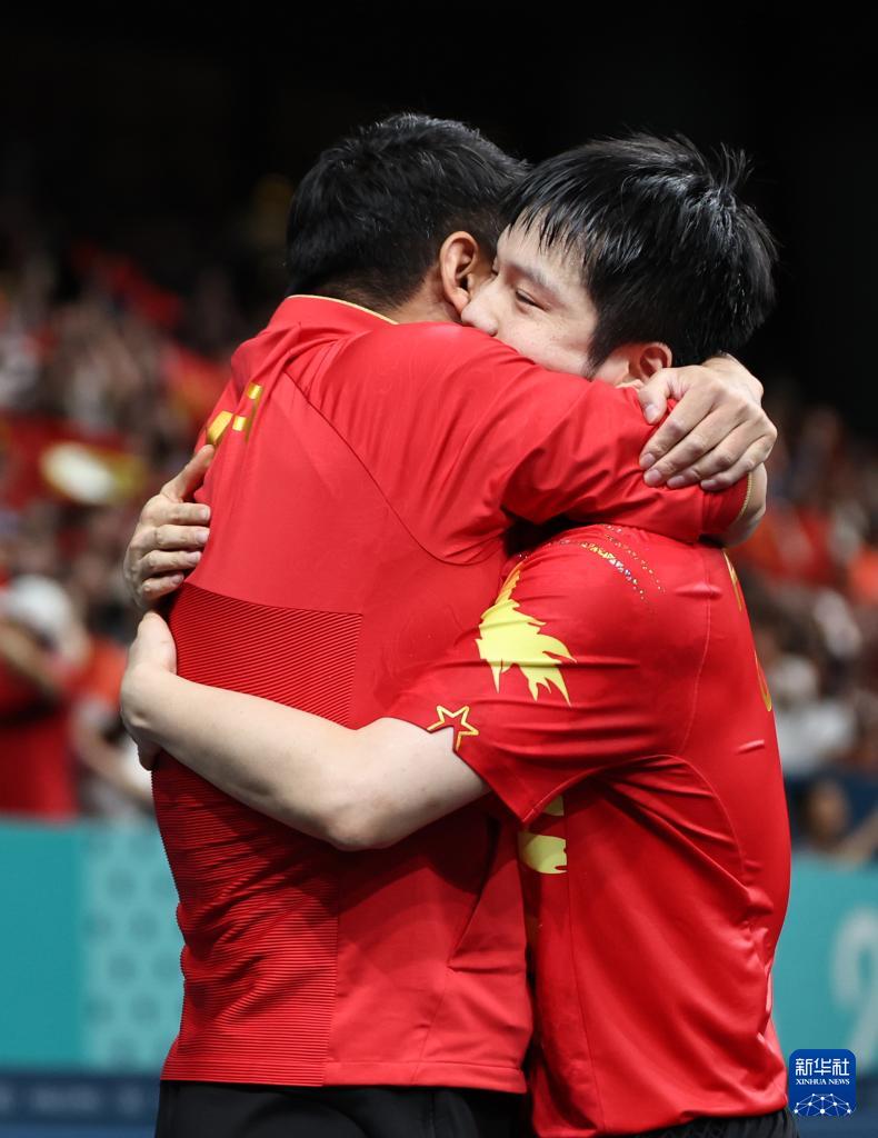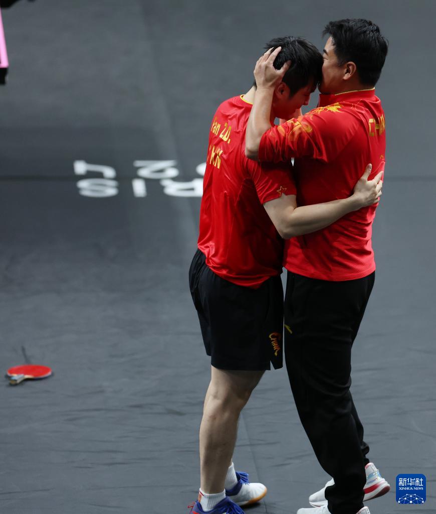 8月4日,樊振東(上)與教練王皓慶祝勝利。