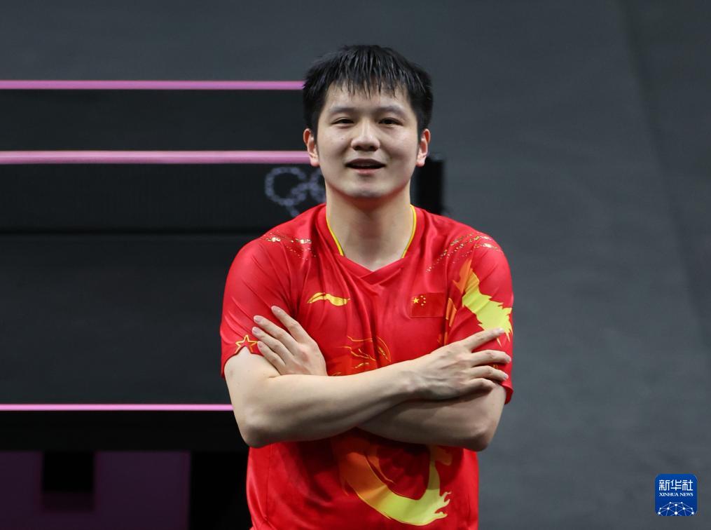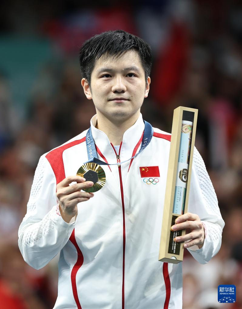 8月4日,冠軍中國(guó)選手樊振東在頒獎(jiǎng)儀式上。