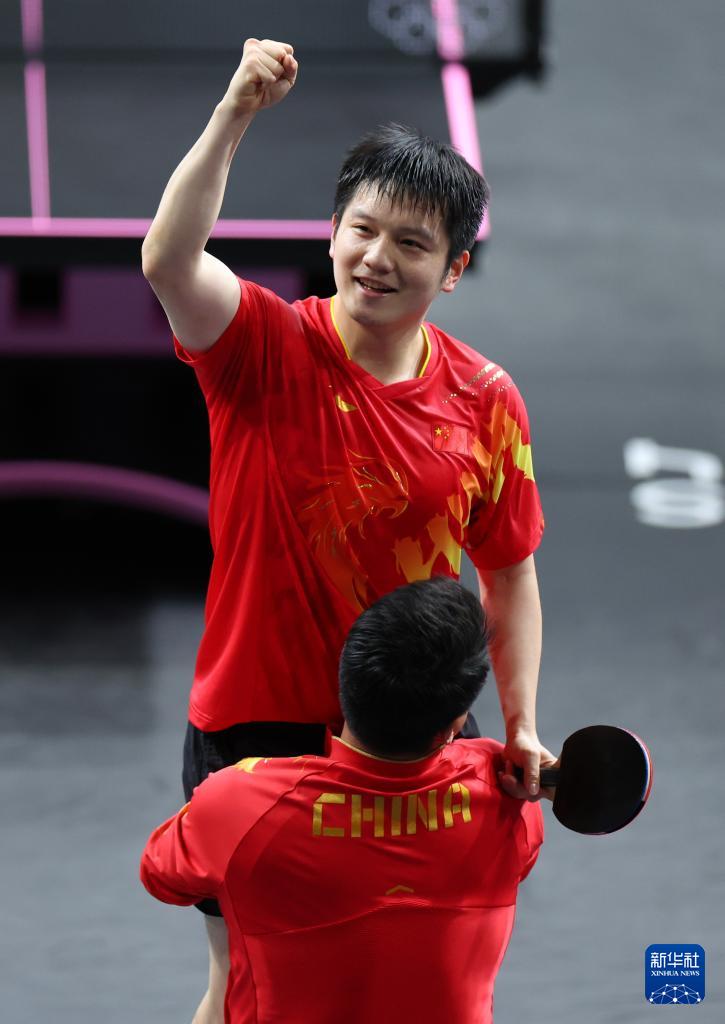 8月4日,樊振東(右)與教練王皓慶祝勝利。