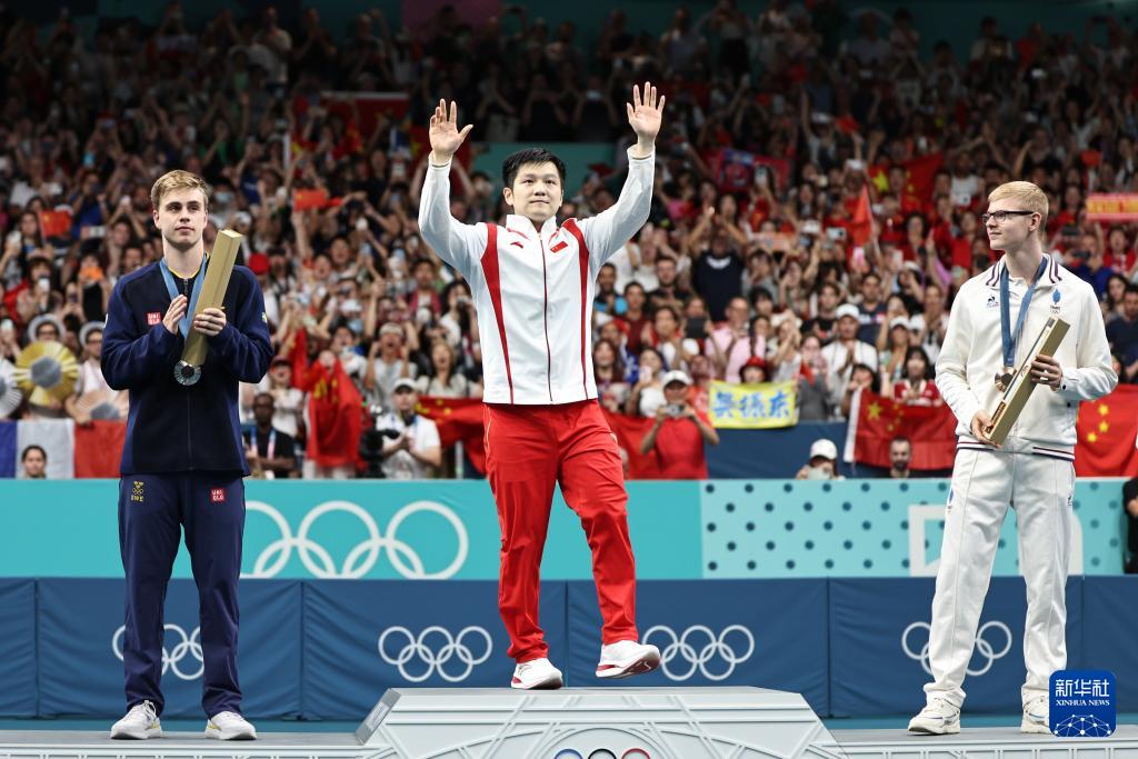 8月4日,冠軍中國(guó)選手樊振東(中)登上領(lǐng)獎(jiǎng)臺(tái)。