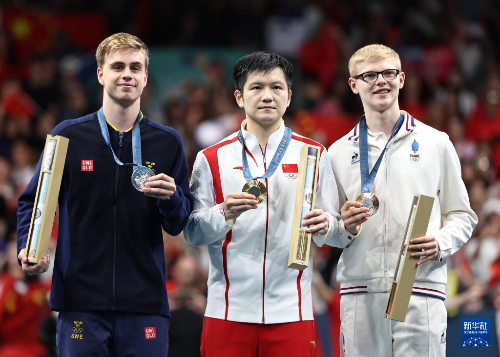 8月4日,冠軍中國(guó)選手樊振東(中)、亞軍瑞典選手莫雷高德(左)、季軍法國(guó)選手菲利克斯·勒布倫在頒獎(jiǎng)儀式上。