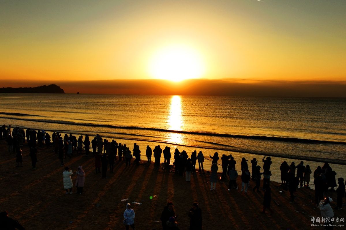 1月1日,山東省青島市嶗山區(qū)石老人海邊,游客觀看海上日出。王海濱 攝