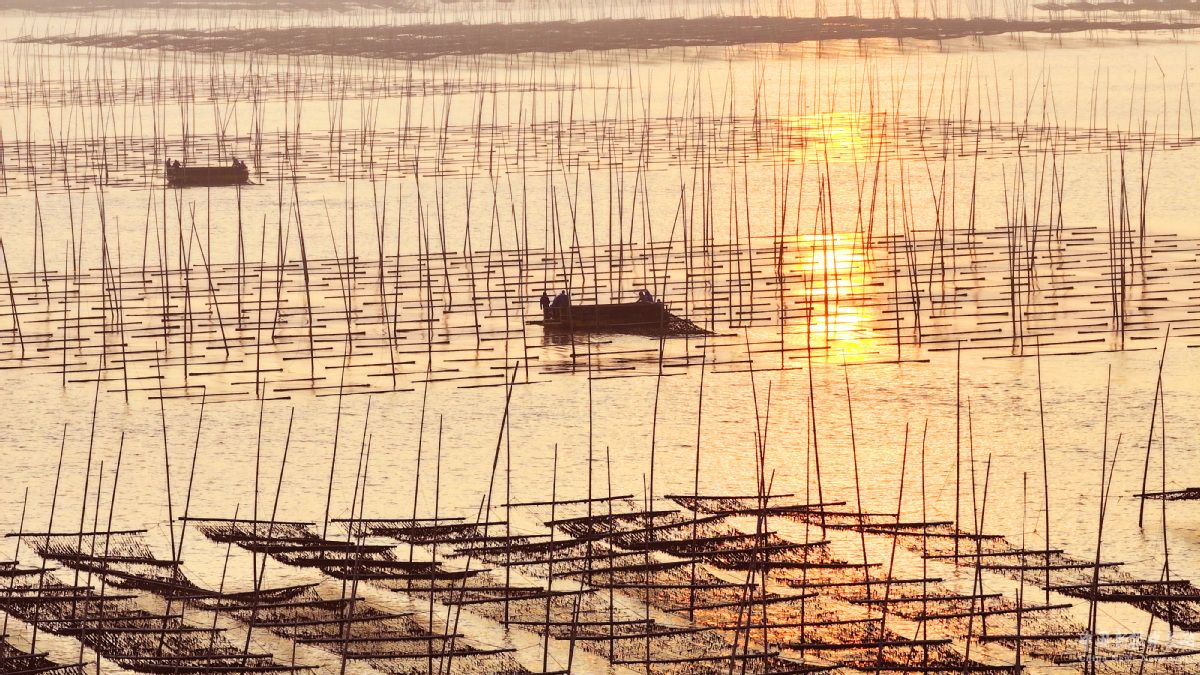 1月1日,浙江省臺州市路橋區(qū)金清鎮(zhèn)沿海,養(yǎng)殖戶沐浴著新年的第一縷陽光收割紫菜。蔣友青 攝
