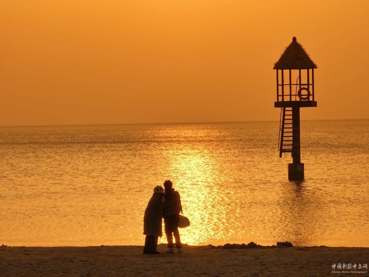 1月1日,江蘇省啟東市圓陀角,一對情侶欣賞海上日出美景。許叢軍 攝