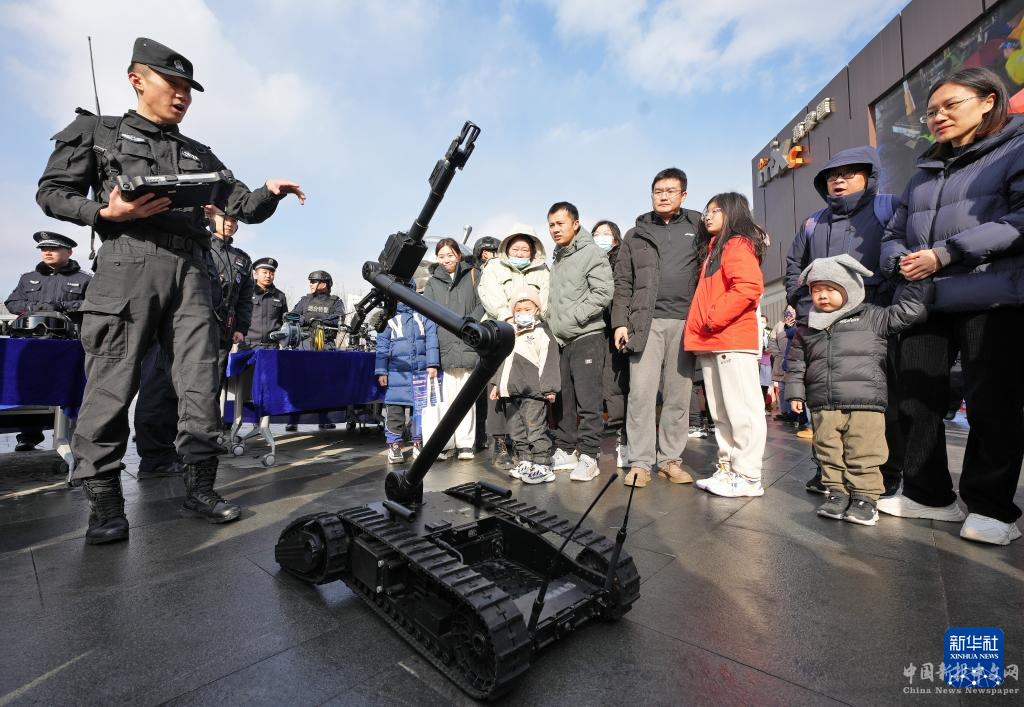 1月7日,市民在山東煙臺萬象匯廣場了解警用排爆機器人。