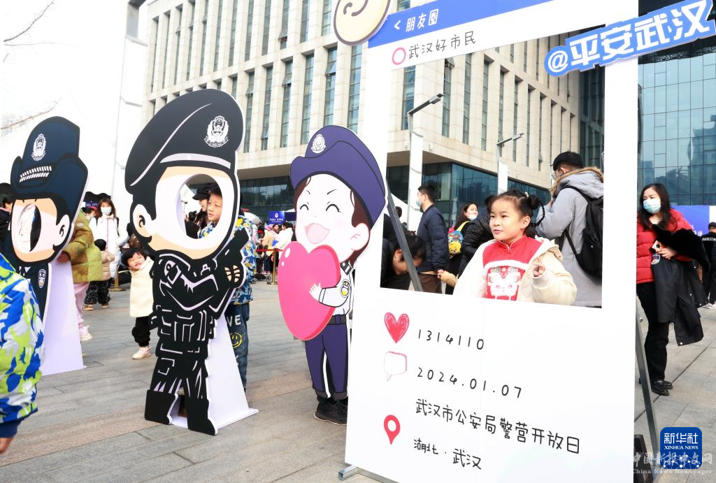 1月7日, 小朋友在武漢市公安局舉行的警營開放日活動現(xiàn)場與卡通造型合影留念。