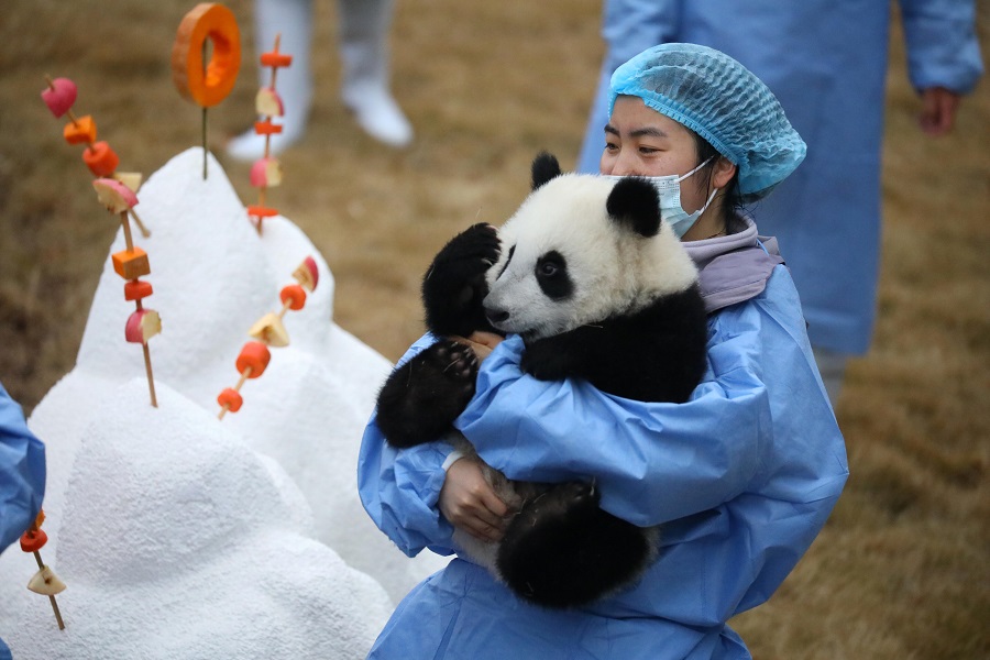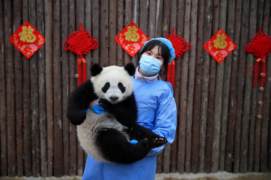 2月4日,在中國(guó)大熊貓保護(hù)研究中心臥龍神樹(shù)坪基地,工作人員抱著大熊貓寶寶亮相。 李傳有 攝