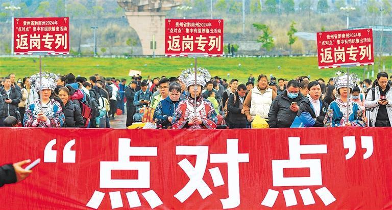 2月17日,來自貴州黔南布依族苗族自治州的返崗務(wù)工人員在都勻東站準(zhǔn)備乘坐返崗專列。 肖 偉攝 (中經(jīng)視覺)