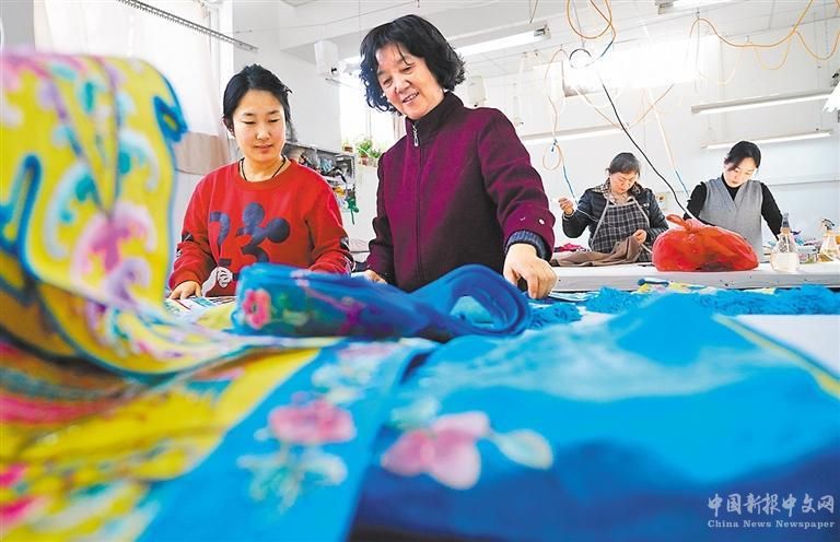 北京工美集團(tuán)有限公司工藝品廠,首席設(shè)計師席聞(左)和同事在交流京繡作品。北京補(bǔ)繡工藝是京繡擴(kuò)展項(xiàng)目,采用浮雕、編織、堆貼等多種工藝。