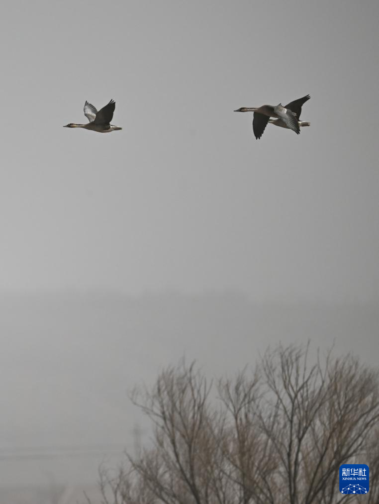 3月16日,在呼和浩特市托克托縣黃河濕地,鴻雁在空中飛翔。