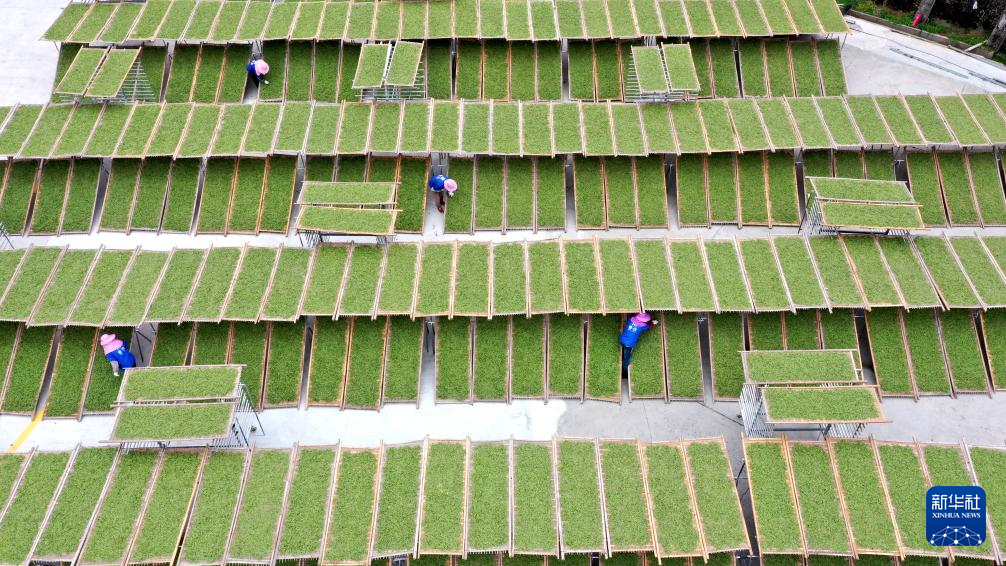 3月26日,茶農(nóng)在福建福鼎市前岐鎮(zhèn)小岳村晾曬白茶(無(wú)人機(jī)照片)。