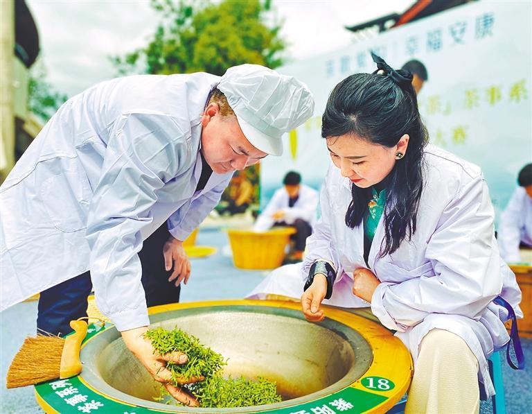 學(xué)生們?cè)趶V西金秀瑤族自治縣大樟鄉(xiāng)三古村茶產(chǎn)業(yè)研學(xué)基地學(xué)習(xí)茶葉制作技藝,體驗(yàn)中國(guó)傳統(tǒng)茶文化。