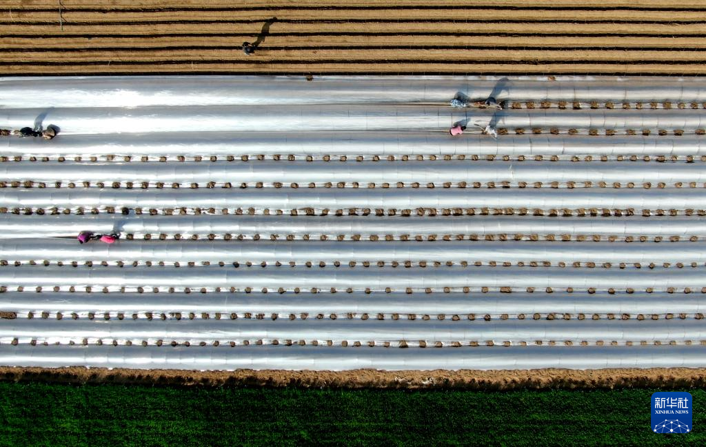 4月4日,在河北省石家莊市欒城區(qū)趙家莊村的農(nóng)田里,姜農(nóng)給剛種植的姜種搭建拱棚(無人機(jī)拍照)。