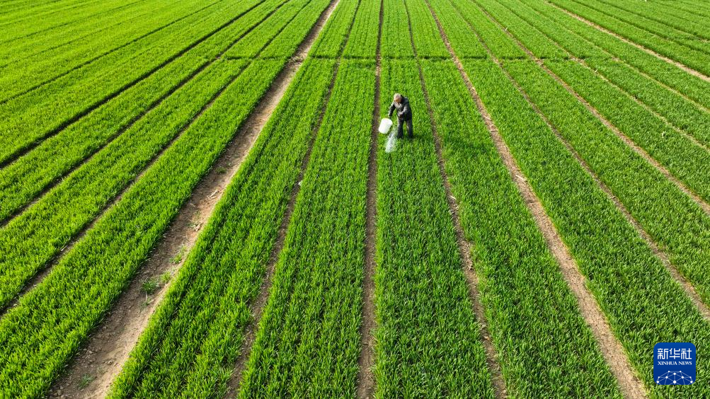 4月4日,河北省遵化市新店子鎮(zhèn)農(nóng)民在麥田里施肥(無人機(jī)照片)。