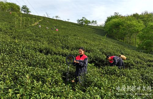 2024年4月9日,安徽省合肥市廬江縣萬山鎮(zhèn)萬金山社區(qū)太生茶葉合作社負(fù)責(zé)人方文華正在生態(tài)茶山上直播村民采茶場景。
