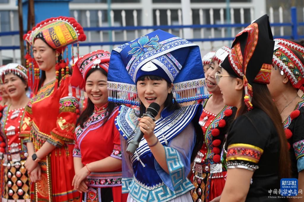 4月10日,老師和孩子們?cè)趶V西南寧市逸夫小學(xué)慶祝“三月三”。