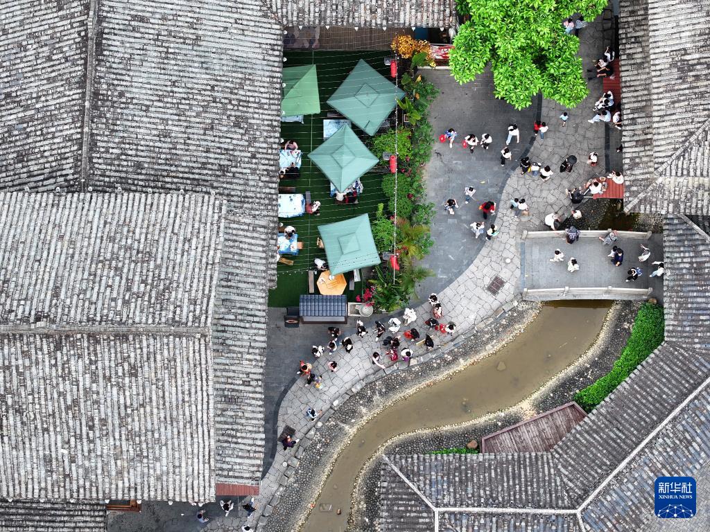 4月12日,人們在廣西南寧市相思小鎮(zhèn)游覽(無人機照片)。