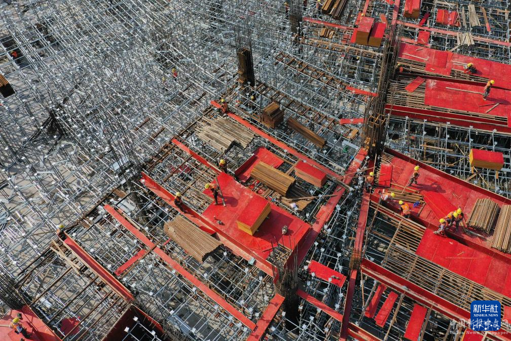 5月1日,中建三局工人在浙江省杭州市余杭國際體育中心項(xiàng)目現(xiàn)場施工作業(yè)(無人機(jī)照片)。