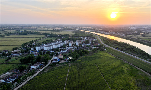 2024年5月8日,安徽省合肥市廬江縣郭河鎮(zhèn)廣寒村,田野里正逐漸轉(zhuǎn)黃的小麥、夕陽映照的杭埠河、阡陌田塍與白墻紅瓦的農(nóng)舍交相輝映,錯落有致,在豐沃的大地上繪出一幅初夏美麗的鄉(xiāng)村風(fēng)光圖。 (巢志斌 攝)