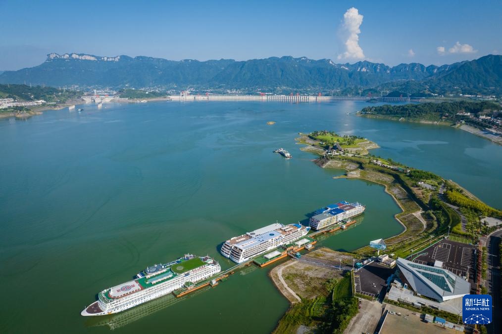 2023年8月4日,船舶??吭陲鰵w港碼頭(無(wú)人機(jī)照片)。近年來(lái),湖北宜昌市著力推進(jìn)岸電建設(shè),建成秭歸港、三峽通航綜合服務(wù)區(qū)、沙灣錨地和仙人橋靠船墩等多個(gè)岸電示范項(xiàng)目,率先在長(zhǎng)江流域?qū)崿F(xiàn)港口岸電全覆蓋,綠色岸電成為船舶待閘期間動(dòng)力的主要來(lái)源。