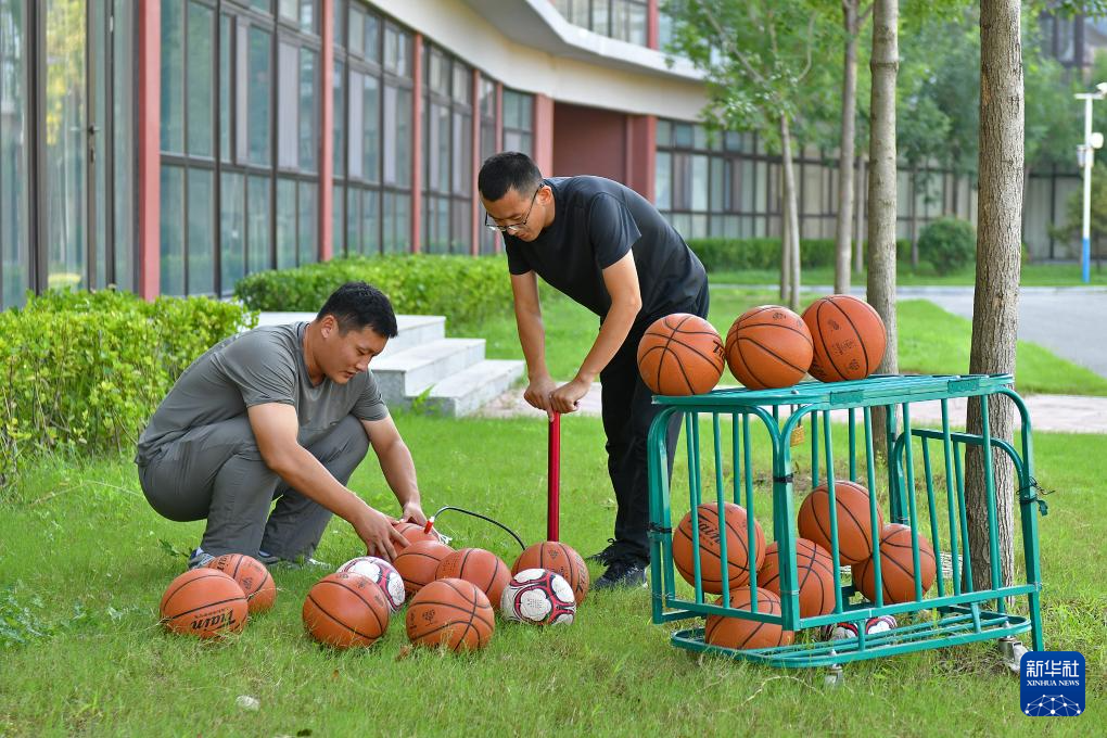 8月30日,山東省煙臺(tái)市福山區(qū)芝陽山學(xué)校的老師在為籃球、足球充氣。