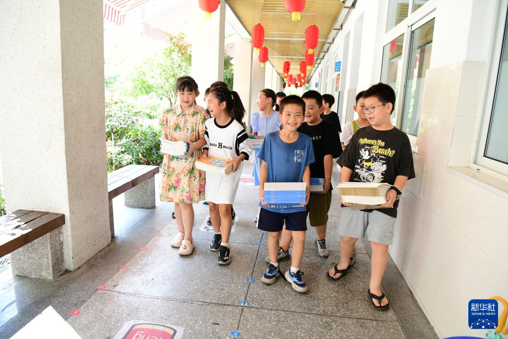 8月30日,在浙江省建德市明鏡小學(xué)校園里,學(xué)生在領(lǐng)取新教材。