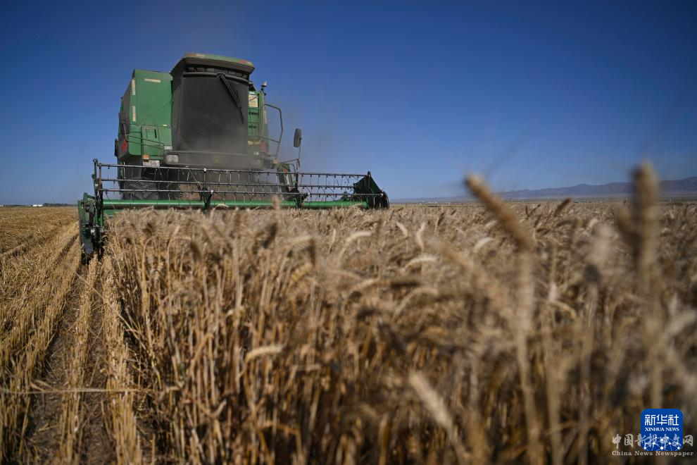 9月7日,農(nóng)戶駕駛收割機(jī)在新疆生產(chǎn)建設(shè)兵團(tuán)第十三師新星市紅山農(nóng)場收割小麥。