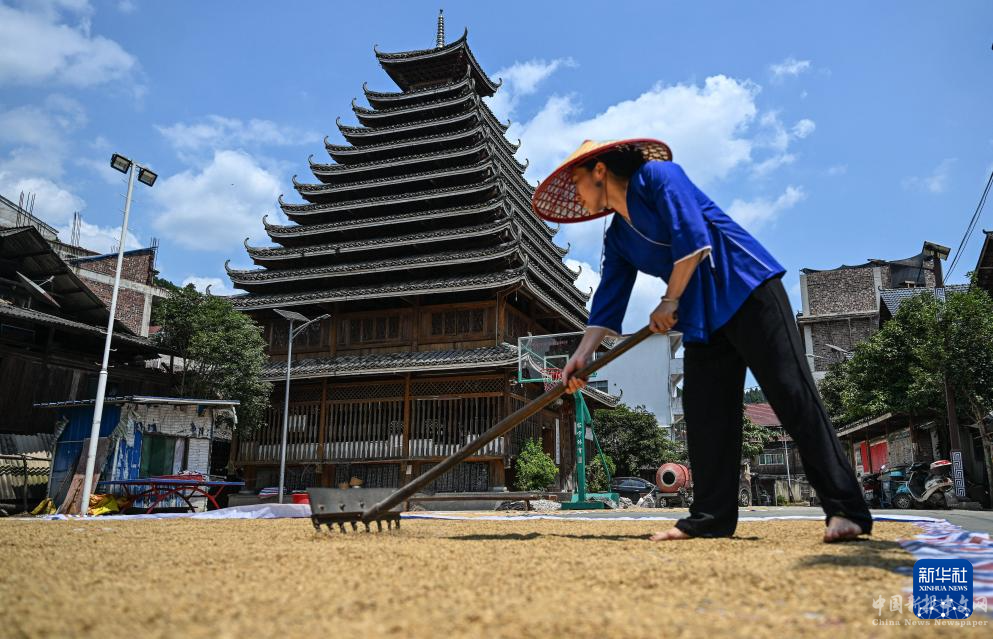 吳春月在三江侗族自治縣良口鄉(xiāng)產(chǎn)口村曬稻谷(8月29日攝)。