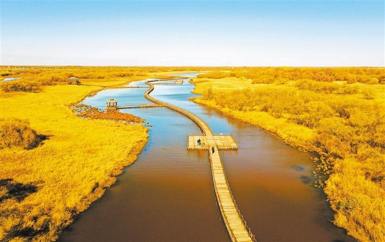 10月12日拍攝的黑龍江省撫遠(yuǎn)市黑瞎子島國家濕地公園。金秋時節(jié),濕地兩岸披上金色“外衣”,景美如畫。本報(bào)記者 高興貴攝