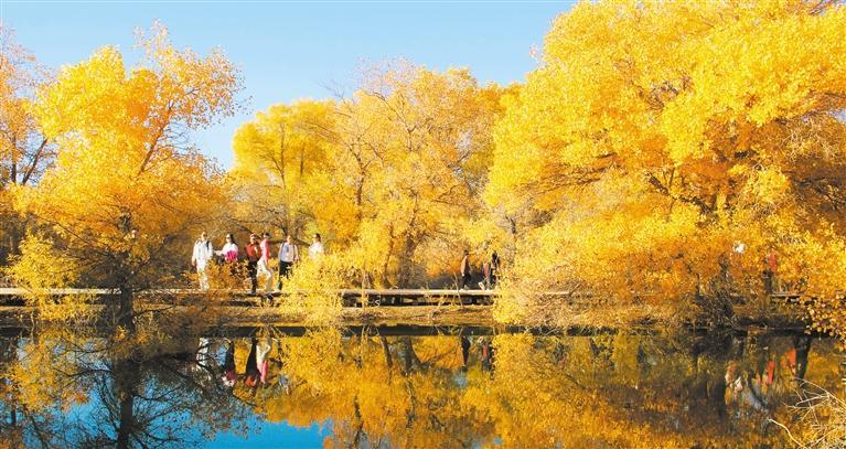 10月12日,游客在甘肅省酒泉市金塔沙漠胡楊林景區(qū)欣賞金色胡楊美景。  許 崗攝  ?。ㄖ薪?jīng)視覺)