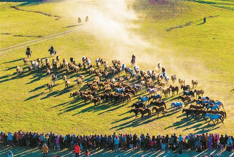 9月25日,內(nèi)蒙古自治區(qū)赤峰市克什克騰旗烏蘭布統(tǒng)景區(qū),壯觀的萬馬奔騰表演,吸引了大批游客和攝影愛好者。  張連華攝 ?。ㄖ薪?jīng)視覺)
