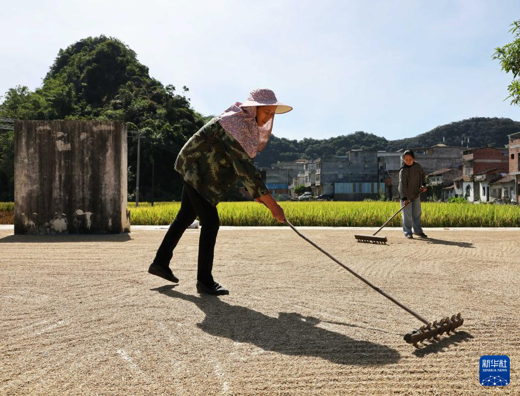 10月24日,在天等縣進結鎮(zhèn),村民在晾曬稻谷。