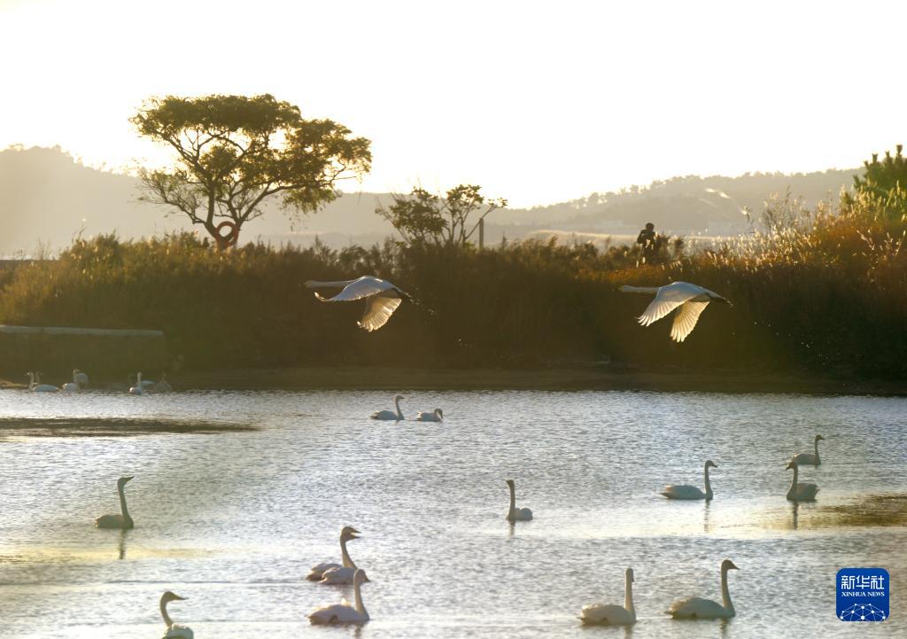 10月28日,大天鵝在山東省榮成大天鵝國家級自然保護區(qū)飛舞。