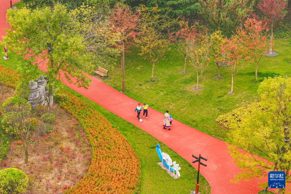 10月27日,市民在山東省榮成市桑干河植物園內(nèi)一處“口袋公園”游玩(無人機照片)。