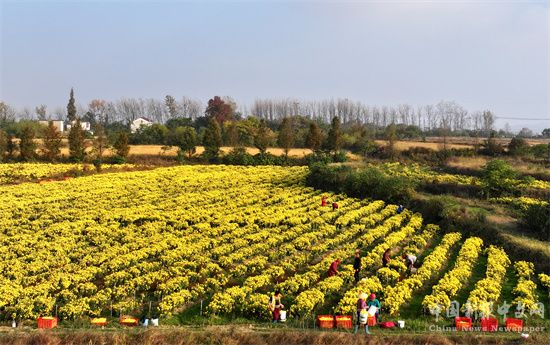2024年11月10日,初冬時(shí)節(jié),安徽省合肥市廬江縣湯池鎮(zhèn)中份村金菊花園家庭農(nóng)場(chǎng)200畝金絲皇菊喜獲豐收,連片的菊花基地變成了金黃色的海洋,香氣宜人,村民們正抓緊晴好天氣采摘、加工、上市。