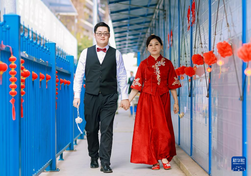 11月23日,一對新人在建筑工地上合影留念。