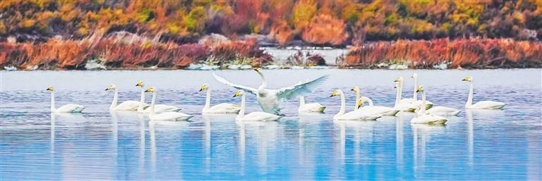 11月9日,野生大天鵝在山西省運(yùn)城市鹽湖濕地越冬,成為一道亮麗的風(fēng)景?! ¢Z 鑫攝(中經(jīng)視覺)