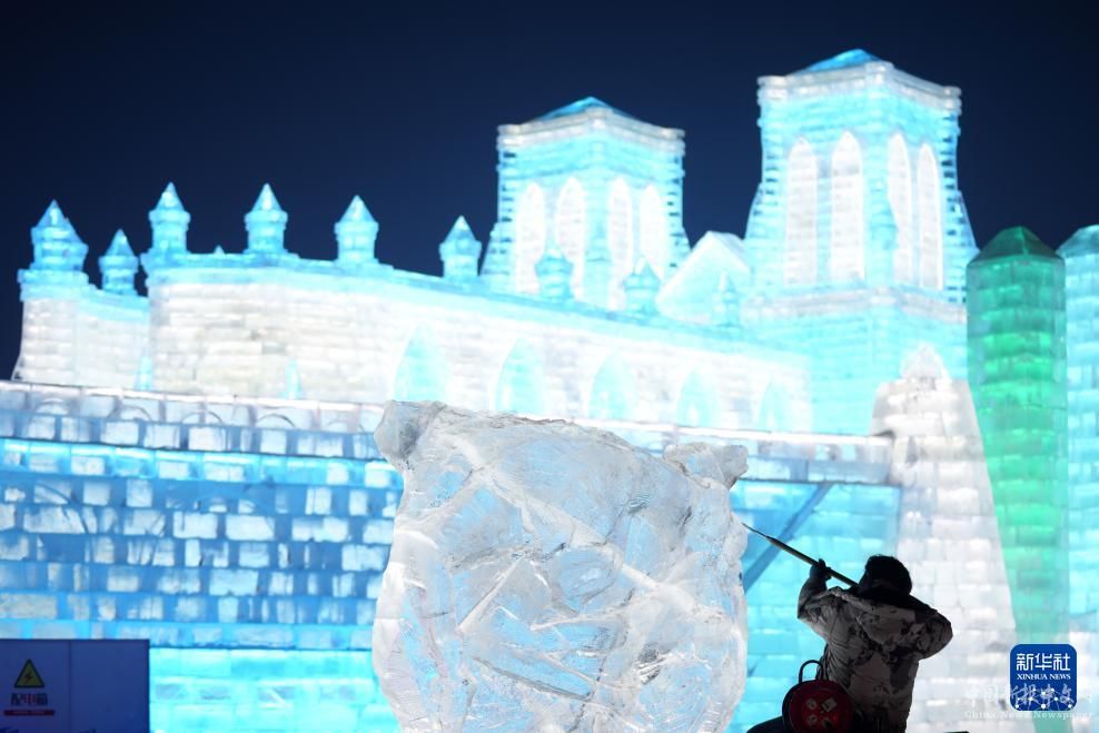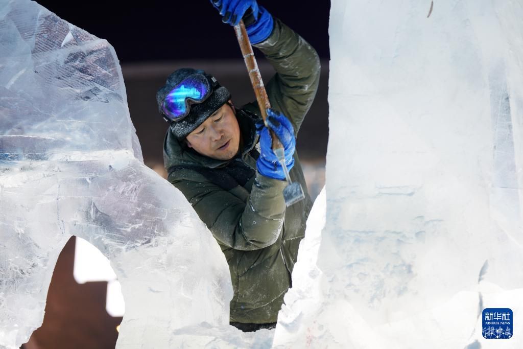 1月2日,在冰雪大世界園區(qū)內(nèi),參賽選手在進(jìn)行冰雕創(chuàng)作。