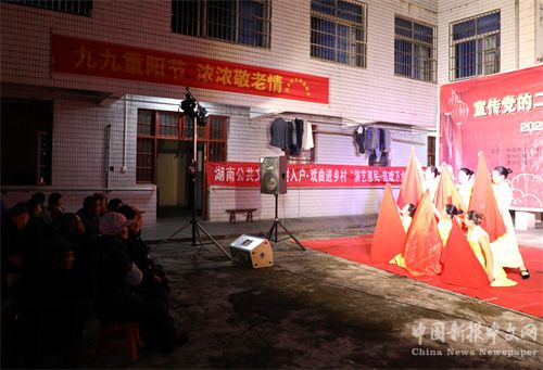 1月3日晚,湖南省保靖縣清水坪鎮(zhèn)文體廣電服務站的文藝隊在敬老院為老人們表演精彩的節(jié)目。近年來,該鎮(zhèn)文體文體廣電服務站組織文藝隊深入各個敬老院,為孤寡老人表演歌舞、獨唱、黃梅戲等節(jié)目,開展“送戲敬老”活動,為老人們送去了關愛,豐富了老人們的精神文化生活。(俞采華 吳大清)