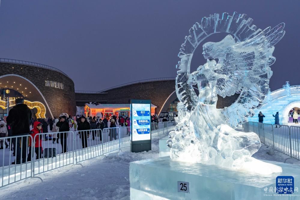 1月4日,在哈爾濱冰雪大世界園區(qū)內(nèi),游客觀賞中國選手參賽冰雕作品《天使的愛》。