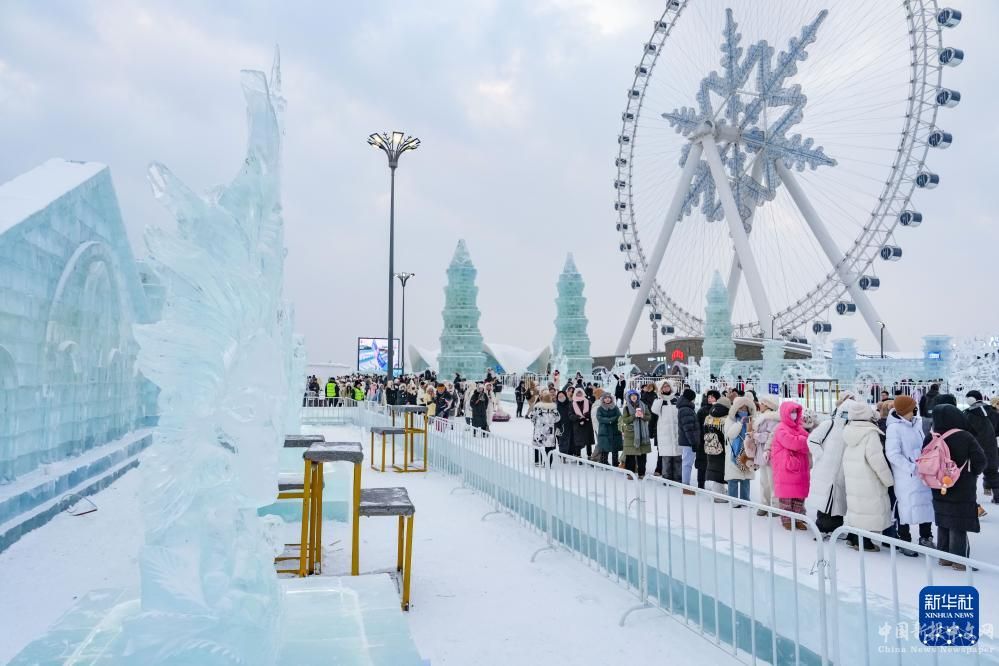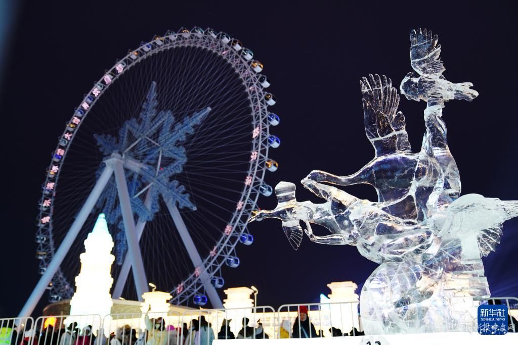 1月4日,在哈爾濱冰雪大世界園區(qū)內(nèi),游客觀賞冰雕作品。