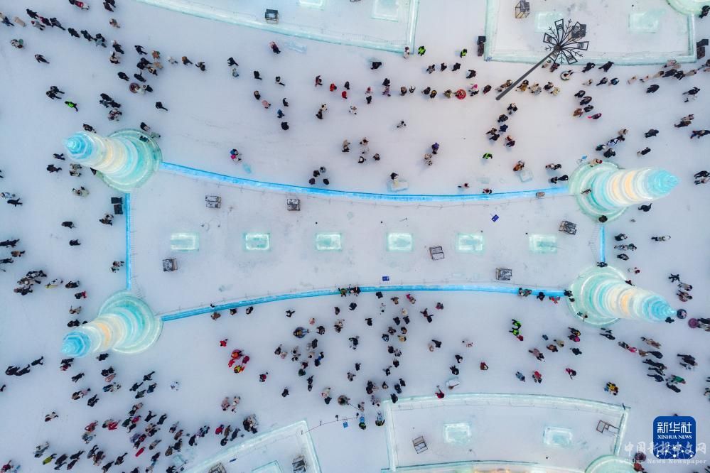 1月4日,在哈爾濱冰雪大世界園區(qū)內(nèi),游客觀賞冰雕作品(無人機照片)。
