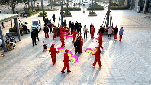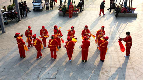 2024年1月6日,在安徽省合肥市廬江縣崗灣街道,當?shù)氐拿耖g演出隊伍長青藝術(shù)團和彩虹花燈腰鼓隊的演員們正在排練非遺民俗節(jié)目打年槍舞蹈和豬八戒搶親,為春節(jié)的到來準備文藝“年貨”,屆時將以傳統(tǒng)的文藝形式歡度傳統(tǒng)佳節(jié)春節(jié)。 (巢志斌 攝)