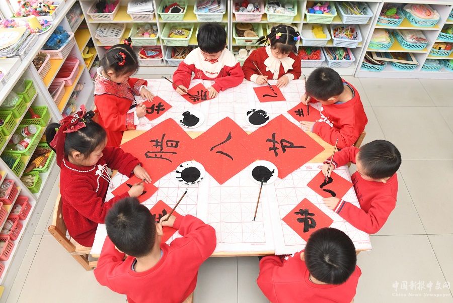 1月17日,河北省石家莊新樂市市直第二幼兒園,小朋友們練習(xí)書寫“臘八節(jié)”書法。賈敏杰 攝