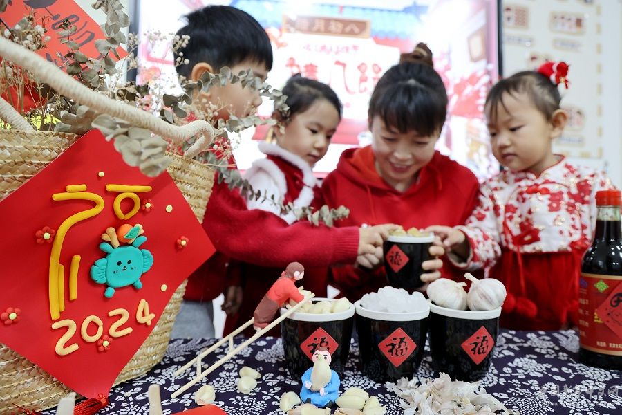 1月17日,山東省濱州市濱城區(qū)清怡幼教集團(tuán)第十一實(shí)驗(yàn)幼兒園,小朋友們在老師的指導(dǎo)下學(xué)習(xí)制作臘八蒜。初寶瑞 攝