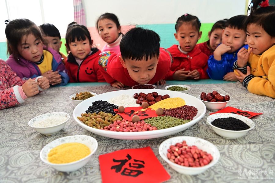 1月17日,山東省聊城市東昌府區(qū)閆寺街道鎮(zhèn)南新村智慧星幼兒園,孩子們學(xué)習(xí)辨識臘八粥食材。張振祥 攝