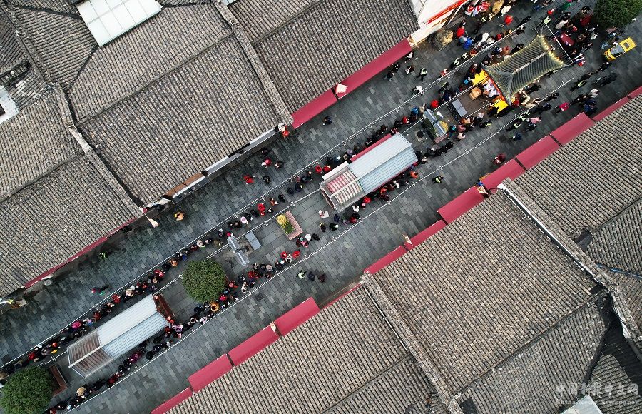 1月18日,浙江省杭州市上城區(qū)河坊街,市民和游客排隊(duì)領(lǐng)取免費(fèi)派送的臘八粥。龍巍 攝